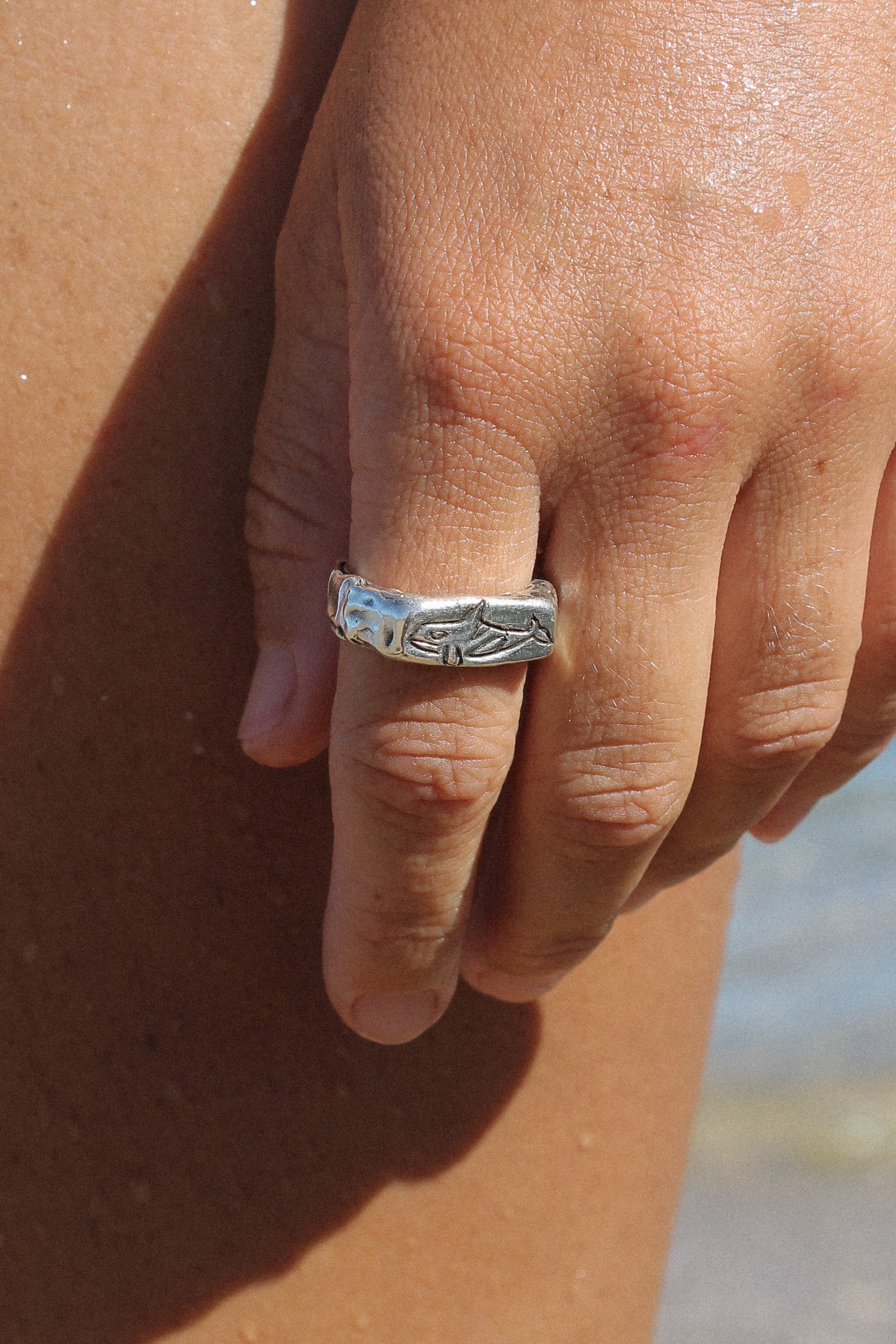 Apex predators and one of the most intelligent animals in the Sea, Orcas can easily captivate the mind and heart. This Sterling Silver signet ring features an orca with a melty textured band.