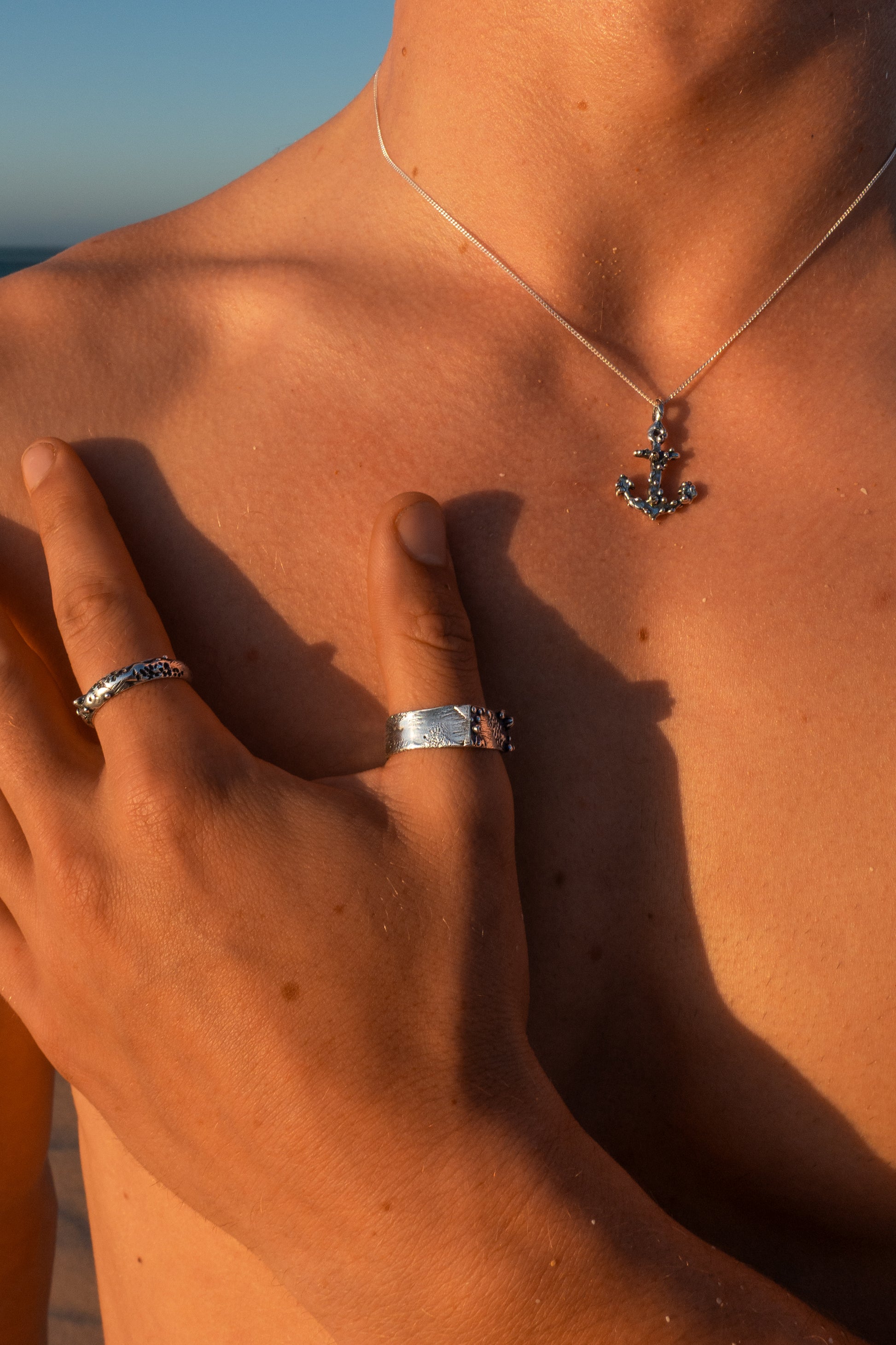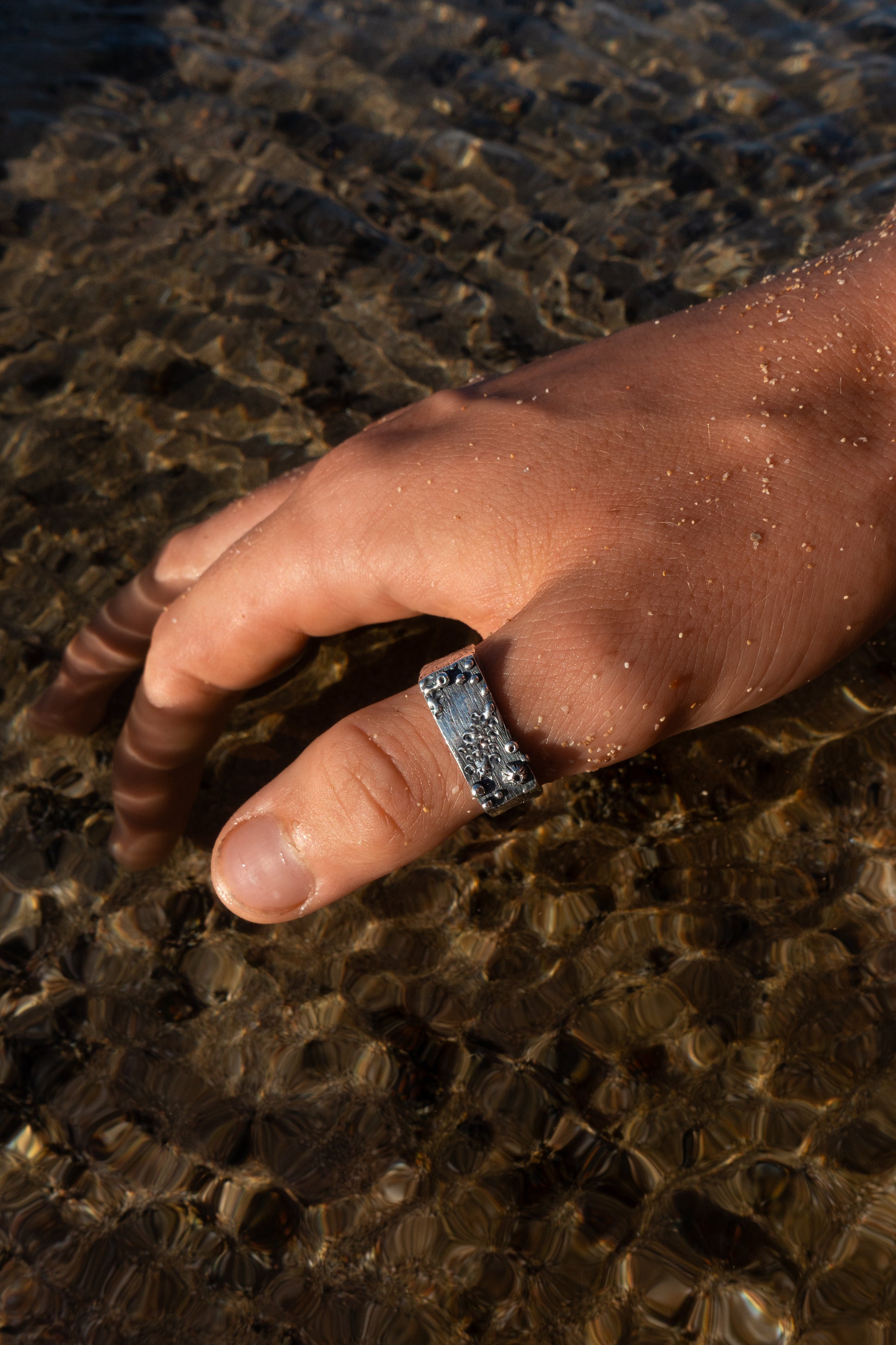 Bring the ocean with you wearing the Sailor Signet Ring. Featuring barnacles on the surface and a textured band with imprinted sand from Esperance, WA.