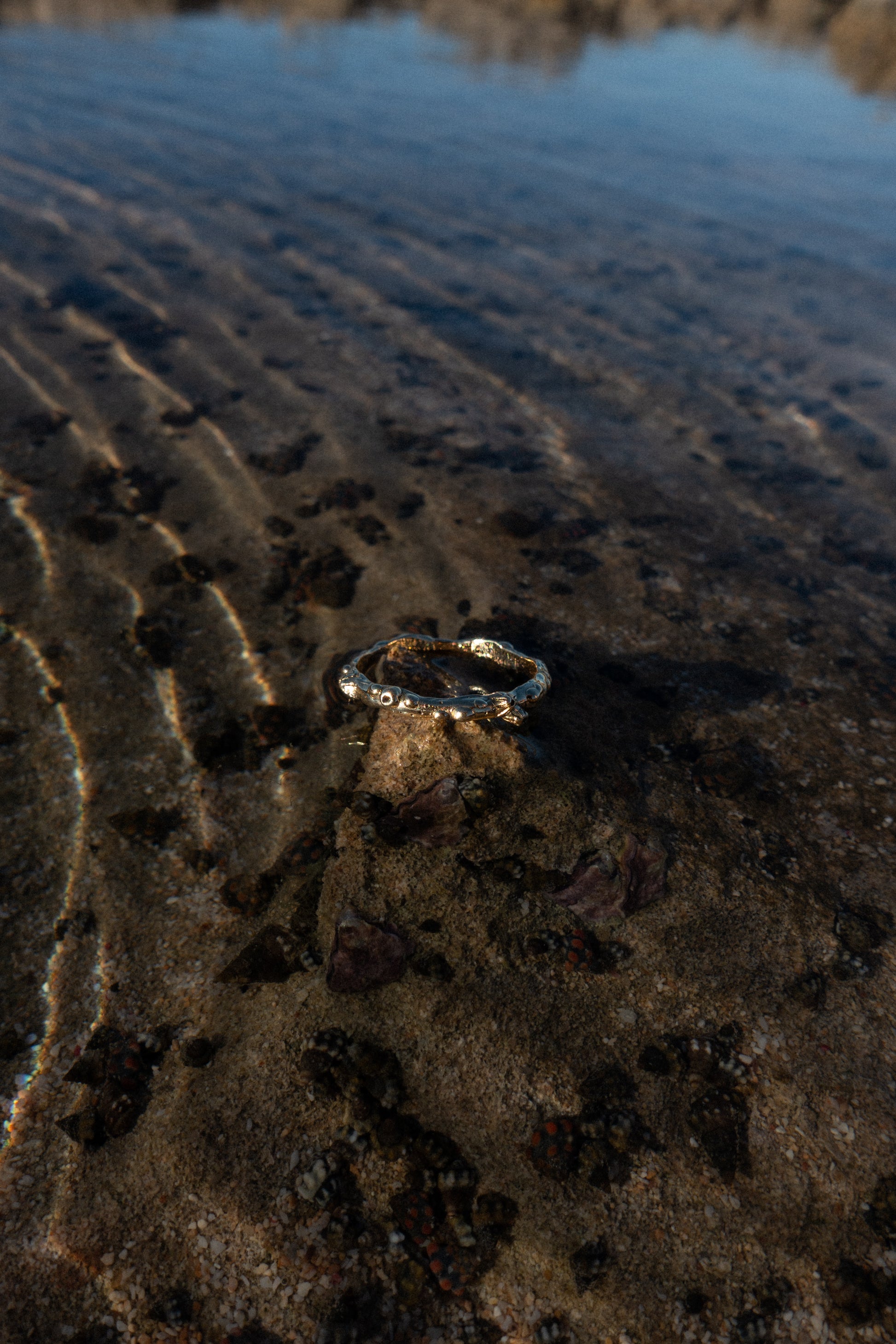 As though it’s been collected from the seafloor on an ancient wreck, this solid gold band has become one with the sea. Dainty and barnacle encrusted ~ enjoy every golden hour in this special one of a kind piece.
