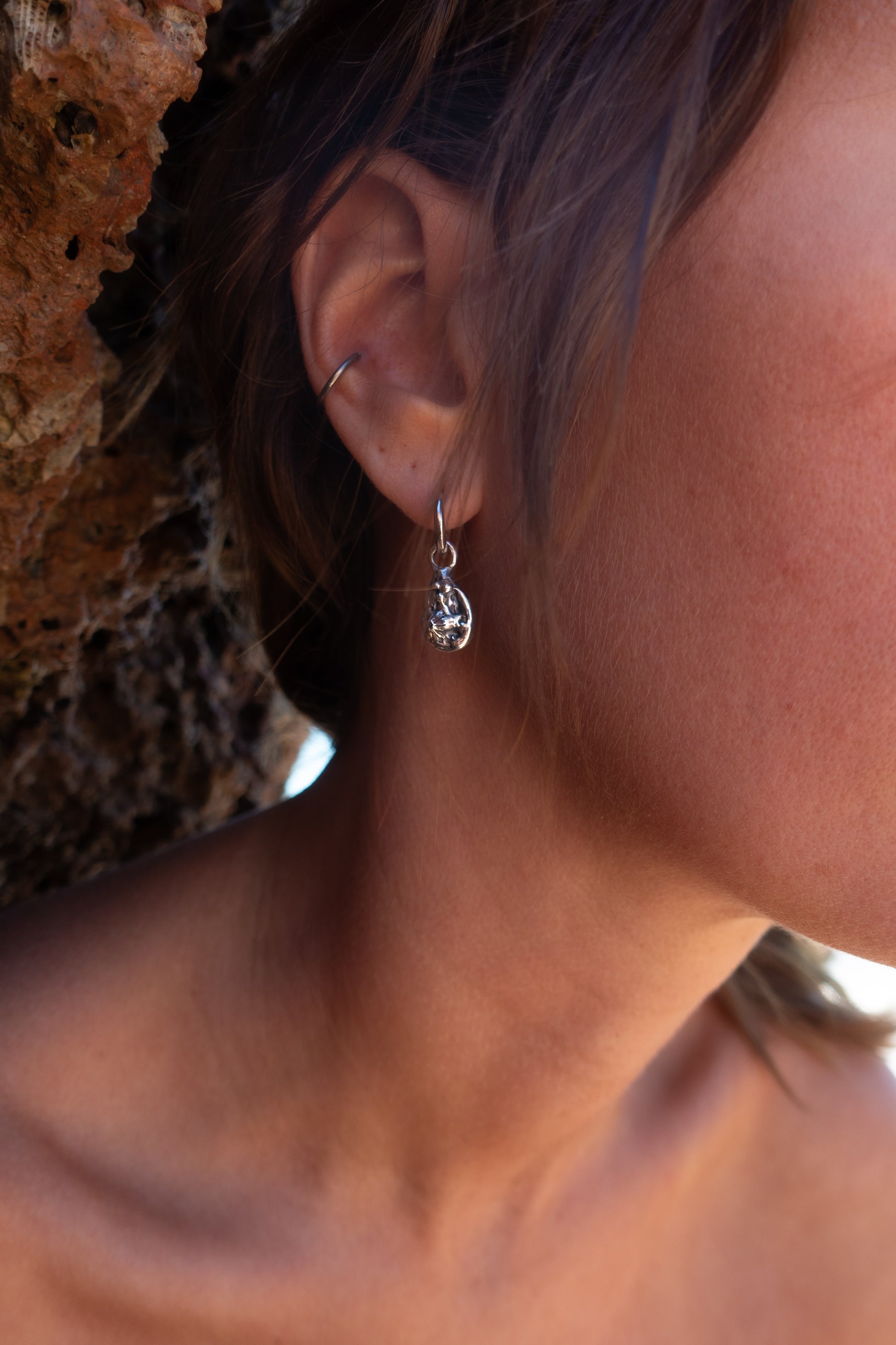 This dainty, asymmetrical pair feature a sea star on one side and a barnacle on the other. Set on 8mm huggies to stay nice and close. Wear them above or below the surface.